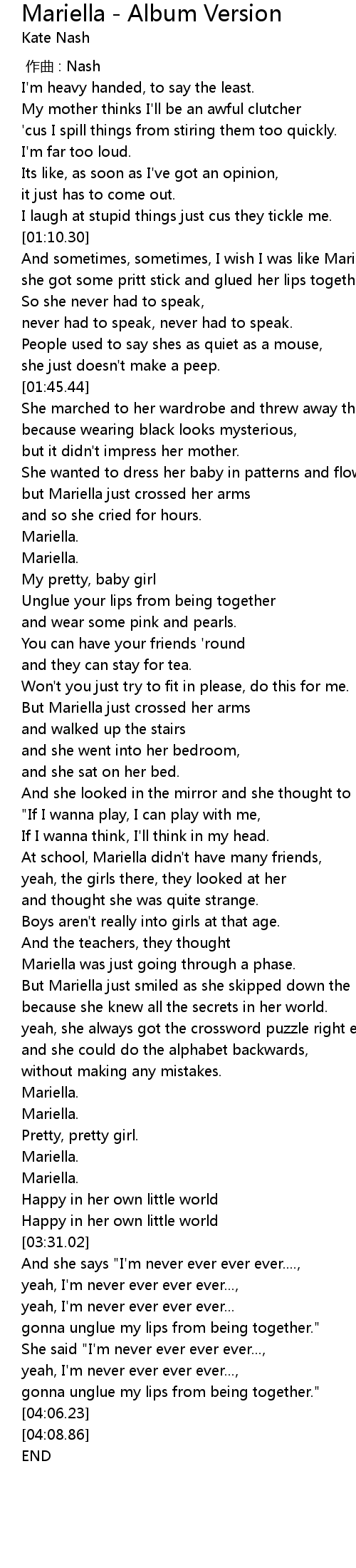 | [01:12.89] | And sometimes, sometimes, I wish I was like Mariella, |