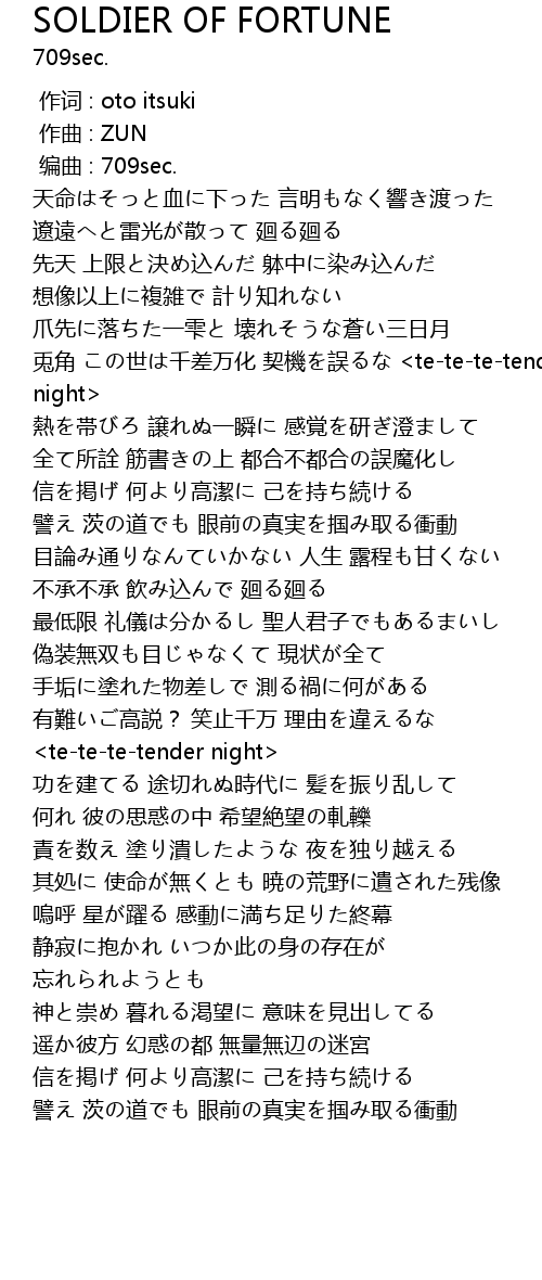 | [01:47.283] | 有難いご高説? 笑止千万 理由を違えるな <te-te-te-tender night> |
