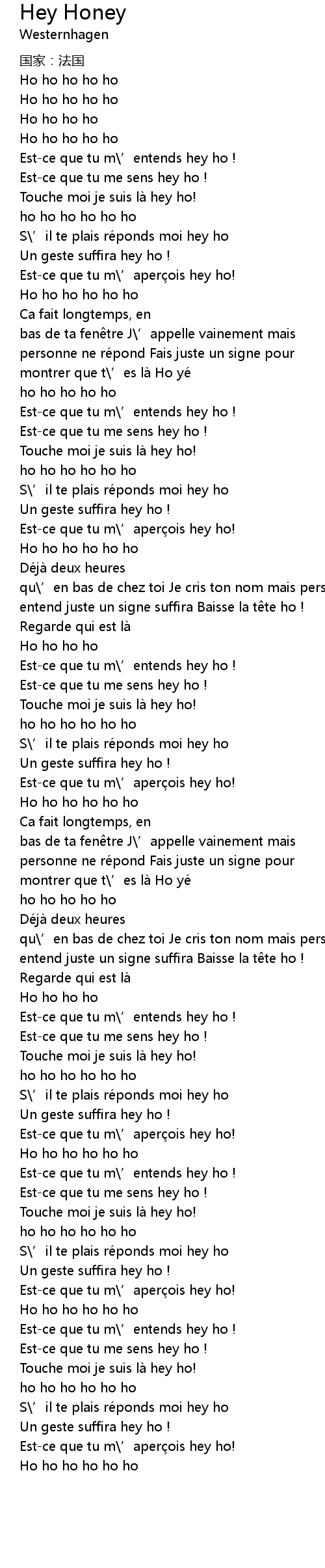 | [01:20.95] | Estce que tu m' entends hey ho ! |