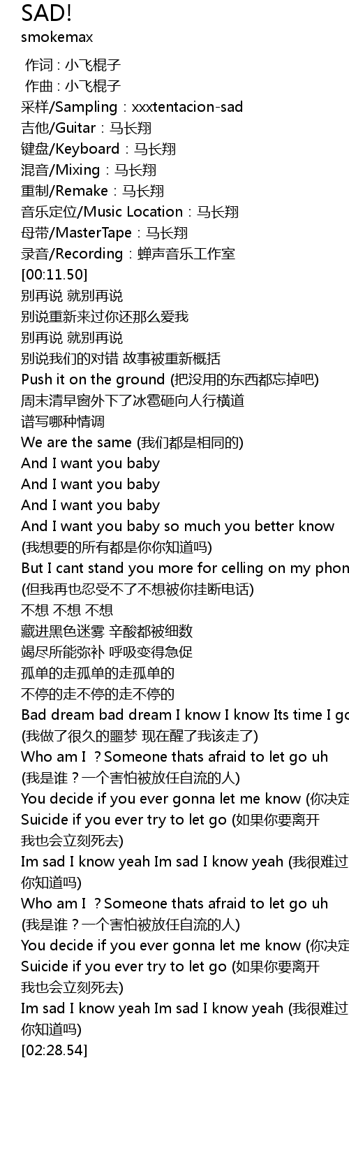 | [01:56.73] | Im sad I know yeah Im sad I know yeah (我很难过 我很悲伤 你知道吗) |