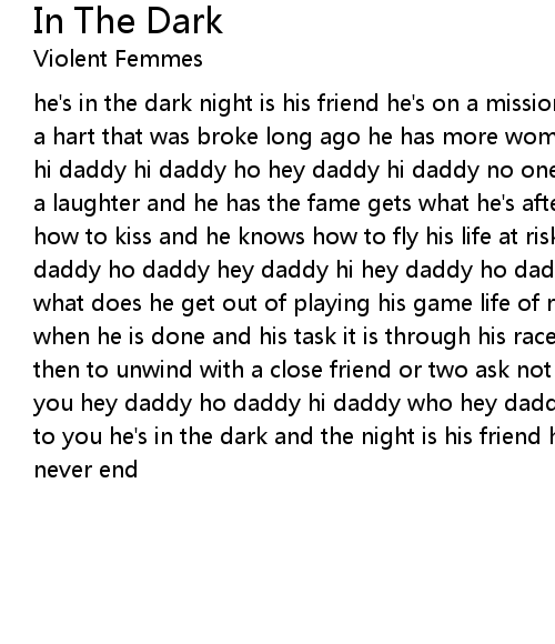 he's in the dark night is his friend he's on a mission that can never end he has a hart that was broke long ago he has more women than you'll ever know hi daddy hi daddy hi daddy ho hey daddy hi daddy no one will know no one will know he has a laughter and he has the fame gets what he's after and wins the last game knows how to kiss and he knows how to fly his life at risk but he never will die, hey daddy ho daddy hey daddy hi hey daddy ho daddy never will die never will die what does he get out of playing his game life of regret and a mother's shame when he is done and his task it is through his race is won and is completed too then to unwind with a close friend or two ask not for me but he'll give it to you hey daddy ho daddy hi daddy who hey daddy ho he will give it to you, give it to you he's in the dark and the night is his friend he's on a mission that can never end |