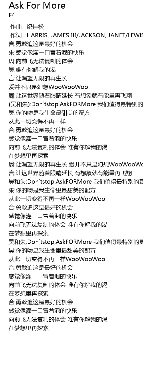 | [00:54.22] | (吴和朱):Don`tstop,AskFORMore 我们值得最特别的更好更多 |