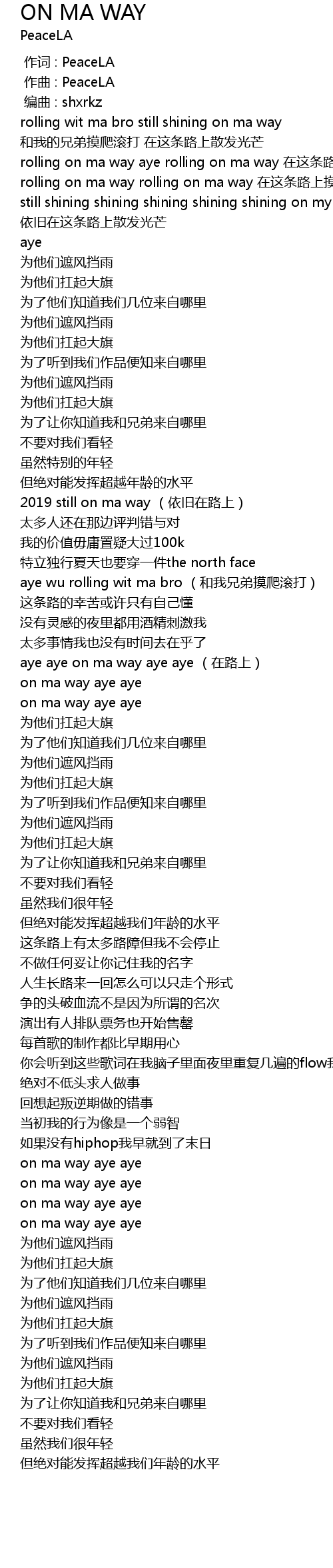 | [00:42.580] | 2019 still on ma way yī jiù zài lù shàng |