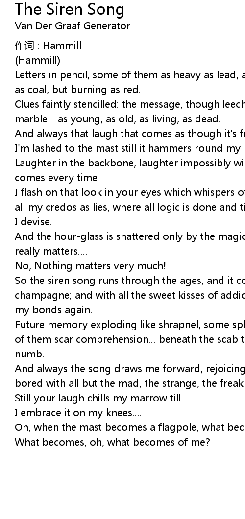 | So the siren song runs through the ages, and it courses through my veins like champagne; and with all the sweet kisses of addiction it's calling me to break my bonds again. | |