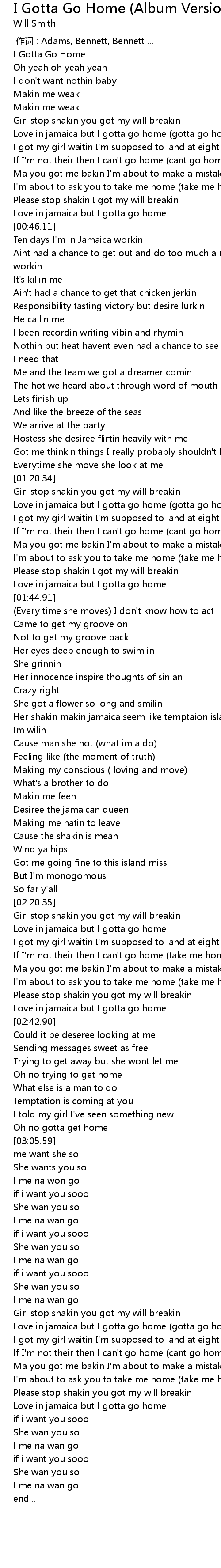 | [01:24.41] | Love in jamaica but I gotta go home (gotta go home) |