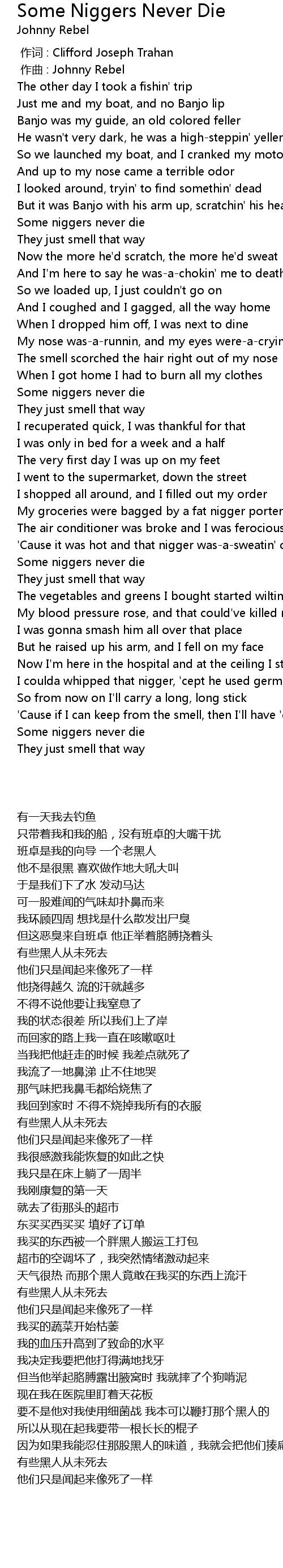 | [02:03.503] | ' Cause it was hot and that nigger wasasweatin' on my groceries |