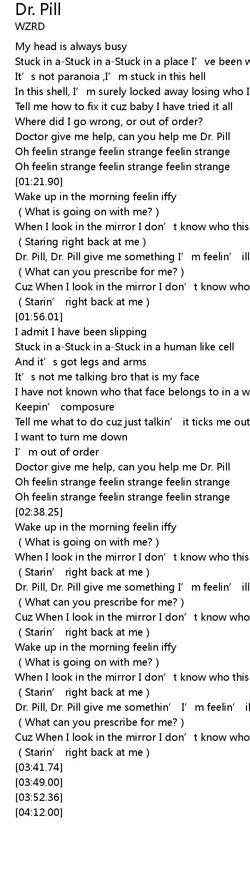 | [01:40.70] | Dr. Pill, Dr. Pill give me something I’m feelin’ ill now |