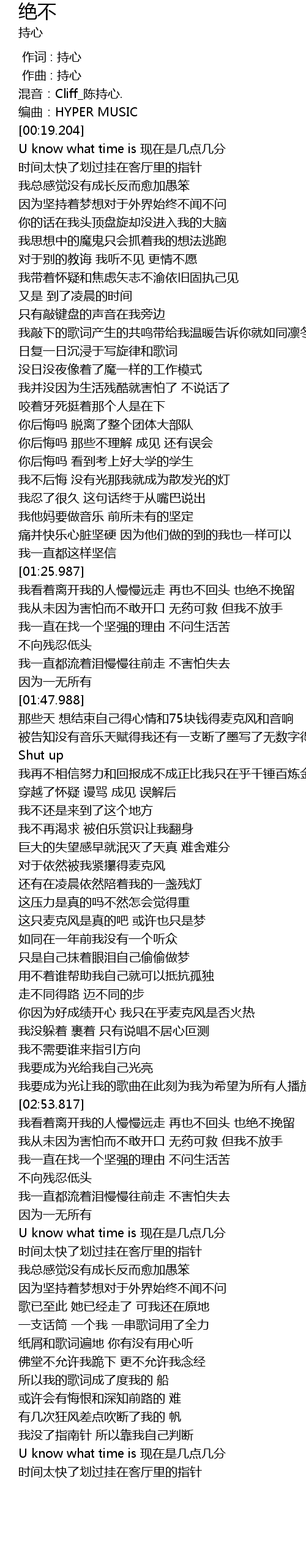 | [01:58.995] | Shut up 我再不相信努力和回报成不成正比我只在乎千锤百炼金刚 |