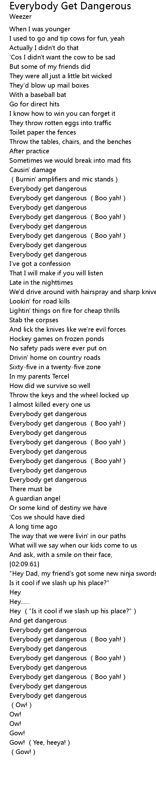 | [00:54.93] | Everybody get dangerous (Boo yah!) |