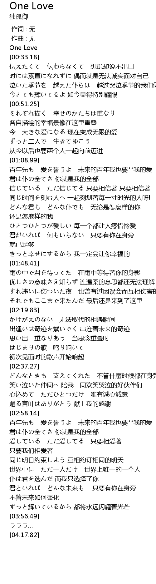 | [03:37.16] | 世界中に ただ一人だけ 世界上唯一的一个人 |