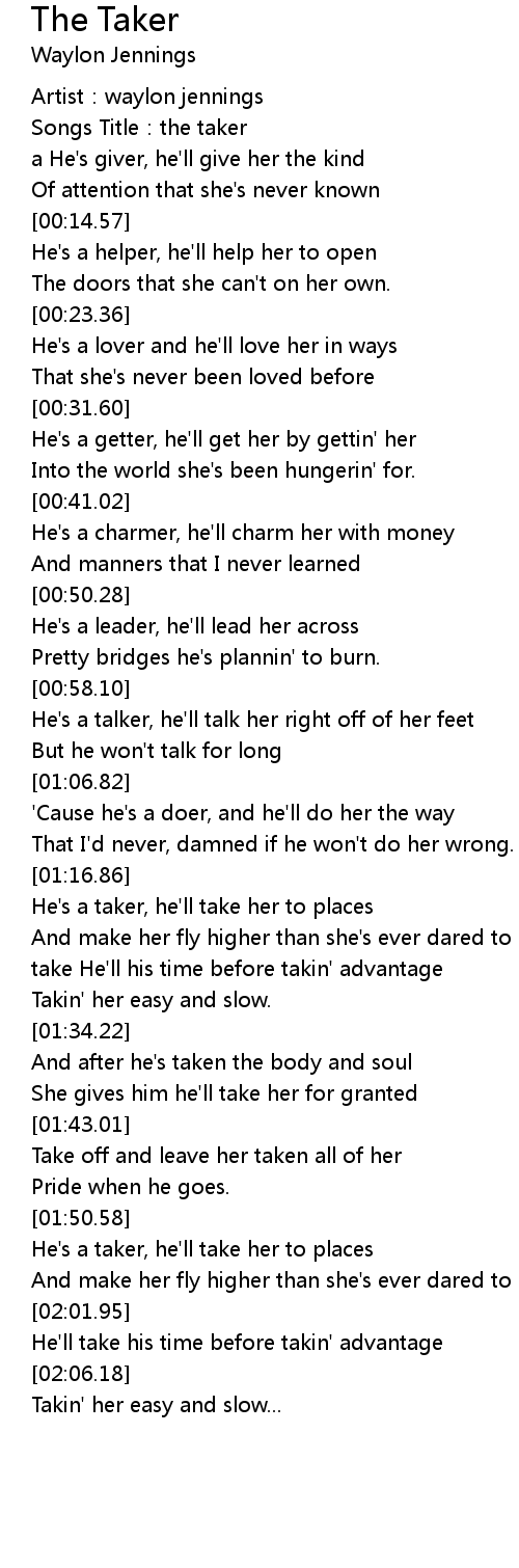 | [01:18.92] | He' s a taker, he' ll take her to places |