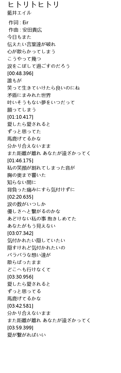 | [01:58.557] | 私の笑顔が割れてしまった音が |