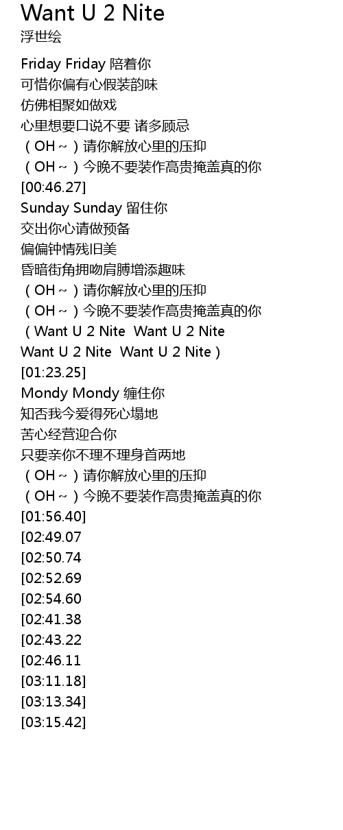 | [02:56.62][02:41.38][02:26.15] | chi lian ni Want U 2 Nite ti xu ni |