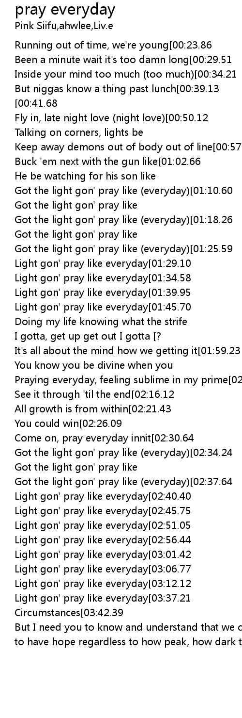 | [00:21.78]Running out of time, we're young[00:23.86]Wondering what kind of time we on[00:26.49]Been a minute wait it's too damn long[00:29.51]Tell me where your timing go[00:31.78]Inside your mind too much (too much)[00:34.21]I be in my head too much (too much)[00:36.59]But niggas know a thing past lunch[00:39.13]Talking to the [?][00:41.68]So far had to preach [?][00:43.74]You know it's all good, all love (all love)[00:47.06]Fly in, late night love (night love)[00:50.12]So your mind say what (say what)[00:52.74]Talking on corners, lights be blind[00:55.23]Keep away demons out of body out of line[00:57.83][?] i be peeking out the blinds[01:00.50]Buck 'em next with the gun like[01:02.66]He need a vest in the sunlight[01:05.55]He be watching for his son like (everyday)[01:08.52]Got the light gon' pray like (everyday)[01:10.60]Got the light gon' pray like (everyday)[01:13.14]Got the light gon' pray like (everyday)[01:15.69]Got the light gon' pray like (everyday)[01:18.26]Got the light gon' pray like (everyday)[01:20.98]Got the light gon' pray like (everyday)[01:23.59]Got the light gon' pray like (everyday)[01:25.59]Light gon' pray like everyday[01:26.87]Light gon' pray like everyday[01:29.10]Light gon' pray like everyday[01:31.95]Light gon' pray like everyday[01:34.58]Light gon' pray like everyday[01:37.18]Light gon' pray like everyday[01:39.95]Light gon' pray like everyday[01:42.75]Light gon' pray like everyday[01:45.70]I'm gon' pray like every day and night too[01:48.98]Doing my life knowing what the strife do[01:51.88]I gotta, get up get out I gotta [?][01:53.79]I gotta insight and use my light thru[01:56.75]It's all about the mind how we getting it[01:59.23]It's all about the time now we're giving it[02:01.99]You know you be divine when you feeling it[02:04.18]Praying everyday, feeling sublime in my prime[02:07.57]I got the light, gon' let it shine[02:10.40]See it through 'til the end[02:16.12]I'm making the vision mine[02:18.08]All growth is from within[02:21.43]Make the most of your minutes[02:24.17]You could win[02:26.09]Pray everyday innit[02:29.41]Come on, pray everyday innit[02:30.64]Got the light gon' pray like (everyday)[02:32.60]Got the light gon' pray like (everyday)[02:34.24]Got the light gon' pray like (everyday)[02:35.75]Got the light gon' pray like (everyday)[02:36.83]Got the light gon' pray like (everyday)[02:37.64]Light gon' pray like everyday[02:39.19]Light gon' pray like everyday[02:40.40]Light gon' pray like everyday[02:42.96]Light gon' pray like everyday[02:45.75]Light gon' pray like everyday[02:48.36]Light gon' pray like everyday[02:51.05]Light gon' pray like everyday[02:53.80]Light gon' pray like everyday[02:56.44]Light gon' pray like everyday[02:59.08]Light gon' pray like everyday[03:01.42]Light gon' pray like everyday[03:04.41]Light gon' pray like everyday[03:06.77]Light gon' pray like everyday[03:09.40]Light gon' pray like everyday[03:12.12]Light gon' pray like everyday[03:14.98]Light gon' pray like everyday[03:37.21]We all will face challenges[03:39.12]Circumstances[03:42.39]And situations that we have no control over[03:45.32] | But I need you to know and understand that we can continue to have hope regardless to how peak, how dark the circumstances may seem |