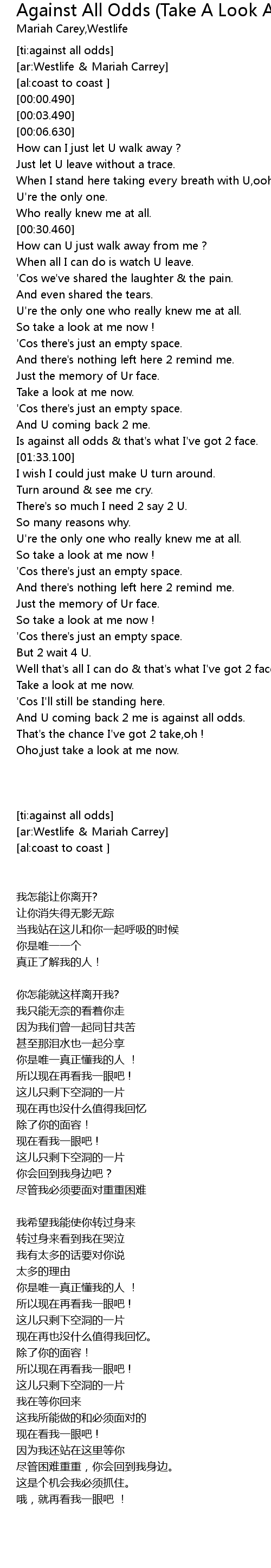 | [02:40.060] | And U coming back 2 me is against all odds. |
