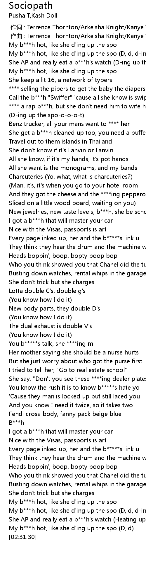 | [02:01.59] | Every page inked up, her and the b*****s link u |
