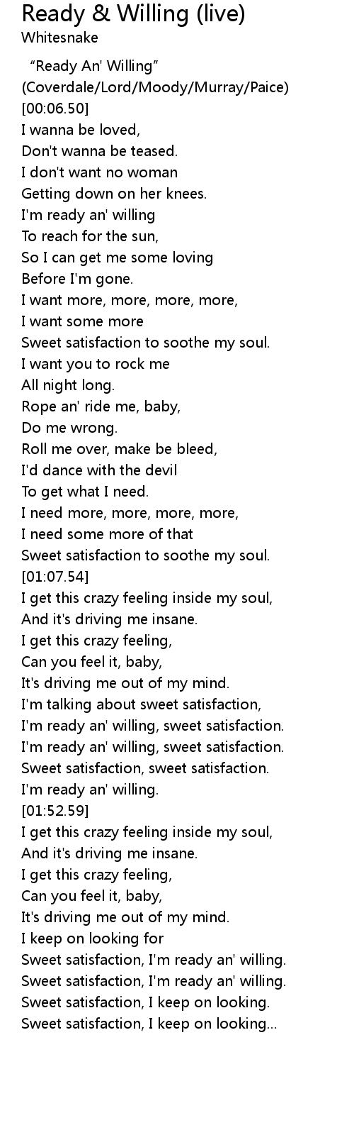 | [01:34.90] | I'm ready an' willing, sweet satisfaction. |