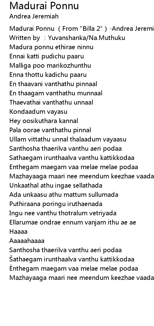 | [00:00.474] | Madurai Ponnu From " Billa 2" Andrea Jeremiah Yuvanshankar Raja |