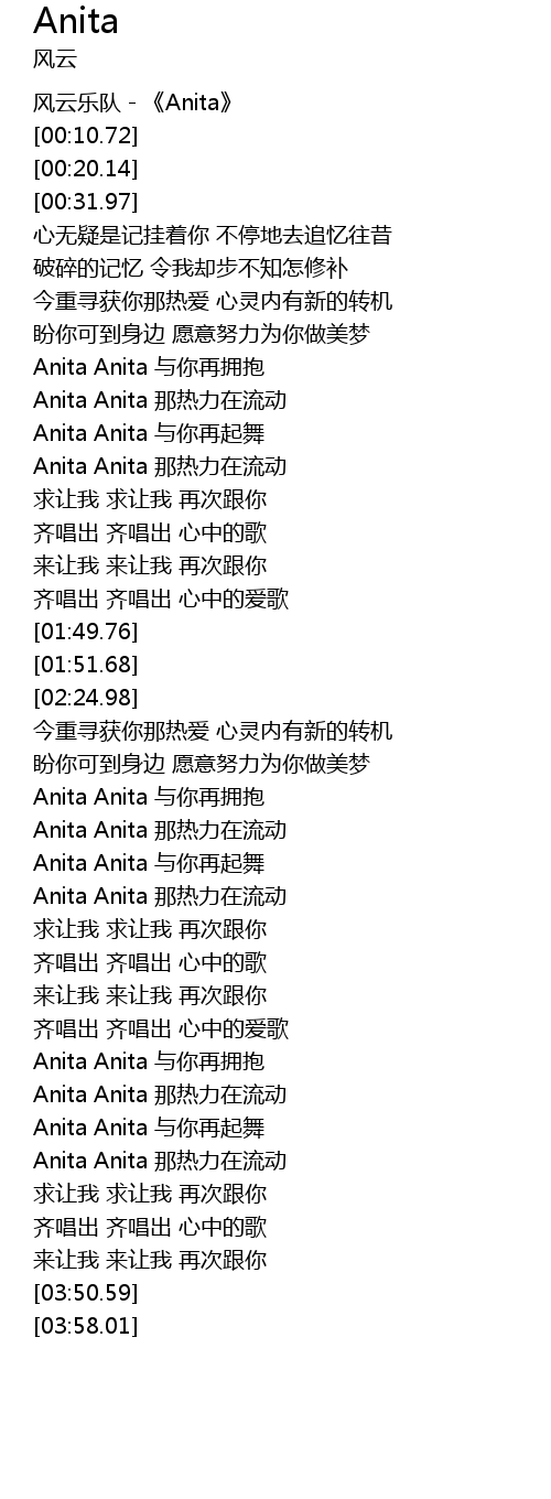 | [00:00.00] | 风云乐队-《Anita》 |