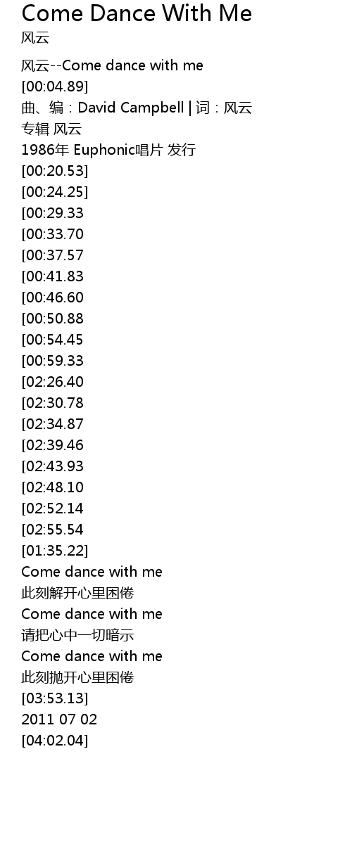 | [00:00.00] | 风云--Come dance with me |