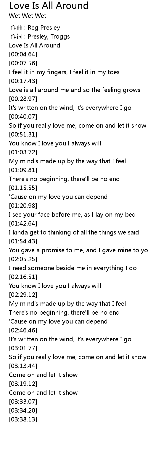 | [00:22.85] | Love is all around me and so the feeling grows |