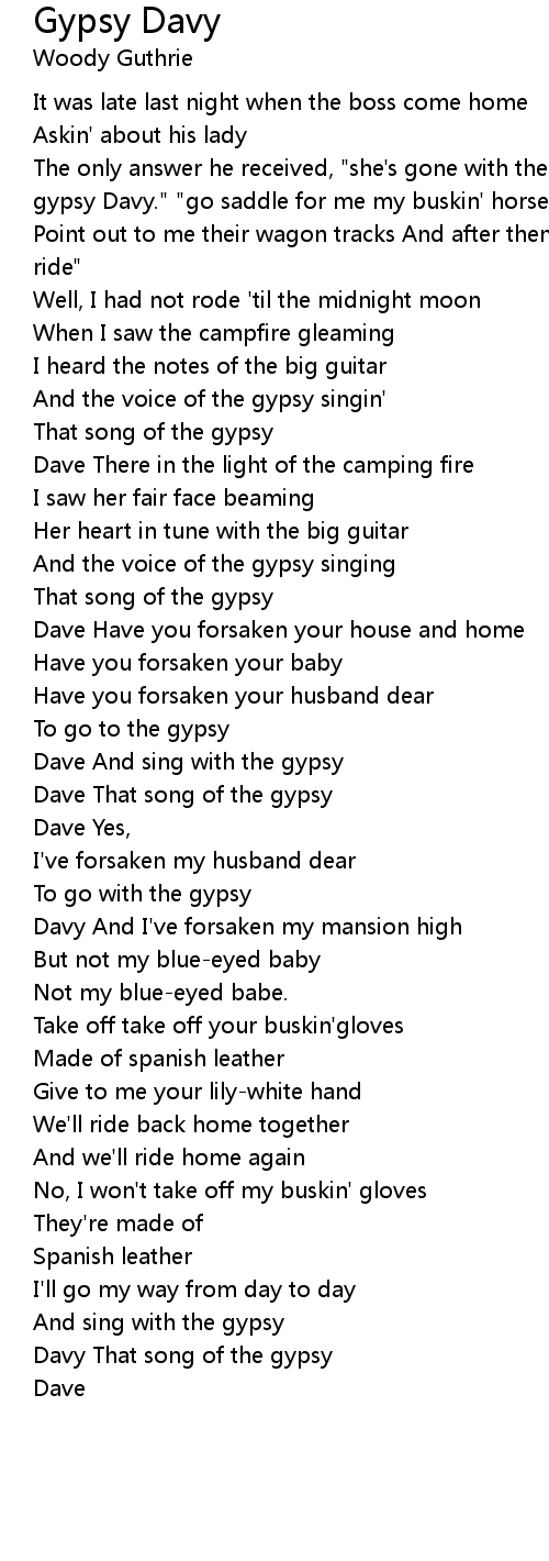 The only answer he received, "she's gone with the Gypsy Davy, gone with the gypsy Davy." "go saddle for me my buskin' horse And a hundred dollars saddle Point out to me their wagon tracks And after them I'll travel, after them I'll ride" |
