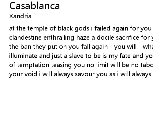 | at the temple of black gods i failed again for you - a chilvarous end for a man clandestine enthralling haze a docile sacrifice for your grace resurrect from the ban they put on you fall again - you will - what they foreknew only gods illuminate and just a slave to be is my fate and you will hear me siren's calls of temptation teasing you no limit will be no taboo of imagination i'll fill your void i will always savour you as i will always be your fool |