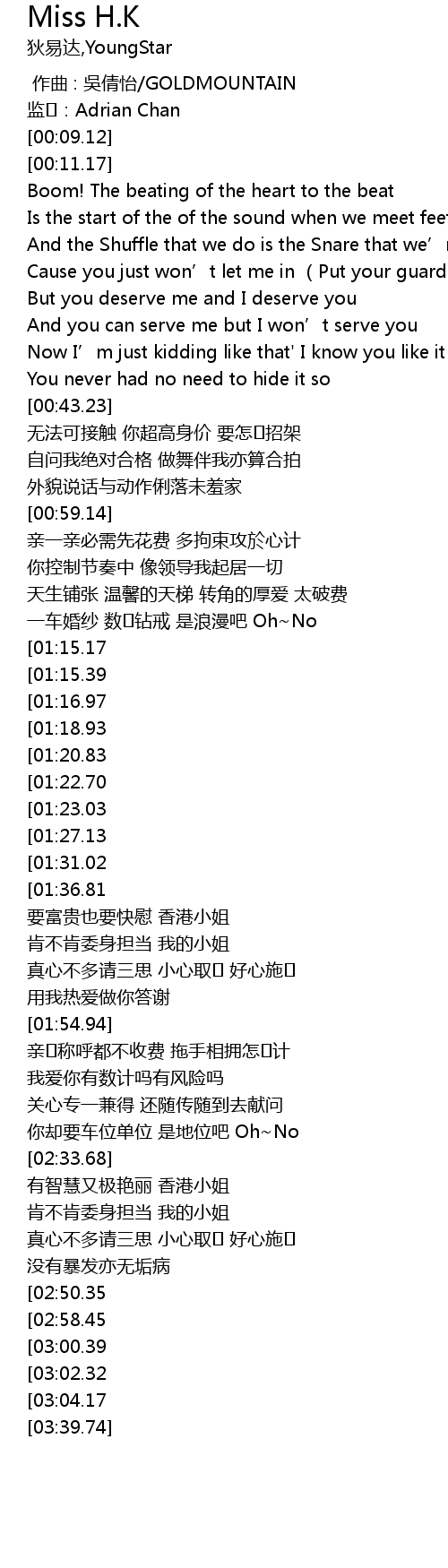 | [02:10.63][01:15.39] | All alone goes Ms. Hong Kong |