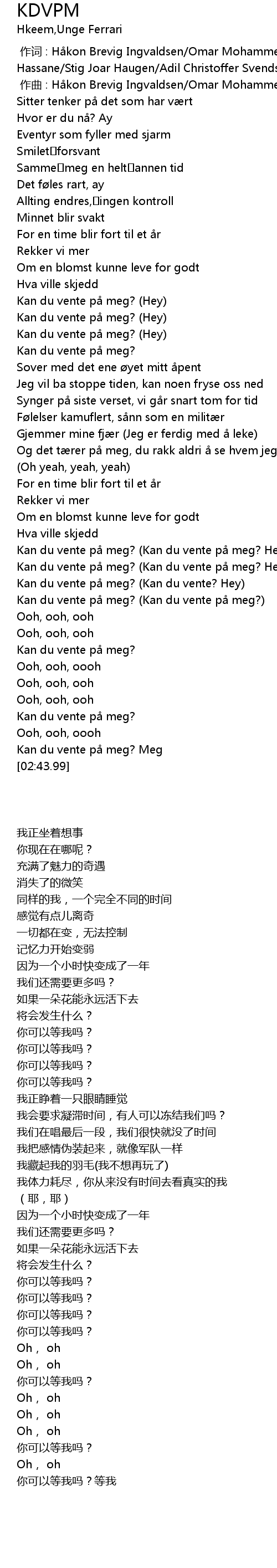 | [02:03.95] | Kan du vente på meg? (Kan du vente på meg? Hey) |