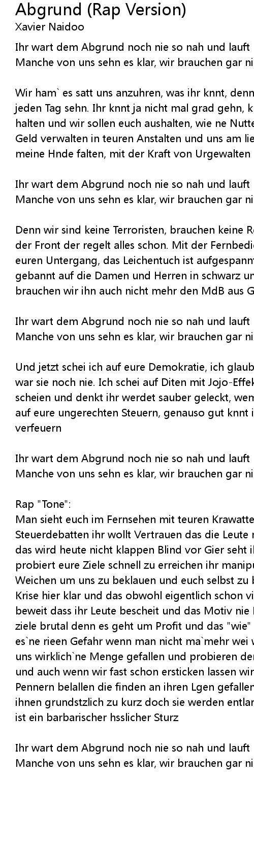 Man sieht euch im Fernsehen mit teuren Krawatten und hrt das Geschwafel von Steuerdebatten ihr wollt Vertrauen das die Leute mal hatten zurckgewinnen doch das wird heute nicht klappen Blind vor Gier seht ihr selten die Zeichen und probiert eure Ziele schnell zu erreichen ihr manipuliert und stellt hier die Weichen um uns zu beklauen und euch selbst zu bereichern wenige sehen diese Krise hier klar und das obwohl eigentlich schon vieles geschah das eindeutig beweit dass ihr Leute bescheit und das Motiv nie Liebe war ihr verfolgt all eure ziele brutal denn es geht um Profit und das "wie" ist egal fr viele bedeutet es`ne rieen Gefahr wenn man nicht ma`mehr wei wie man Miete bezahlt wir lassen uns wirklich`ne Menge gefallen und probieren den Grtel immer enger zu schnallen und auch wenn wir fast schon ersticken lassen wir uns immer noch von diesen Pennern belallen die finden an ihren Lgen gefallen denn die Wahrheit kommt bei ihnen grundstzlich zu kurz doch sie werden entlarvt und was sie danach erwartet ist ein barbarischer hsslicher Sturz |