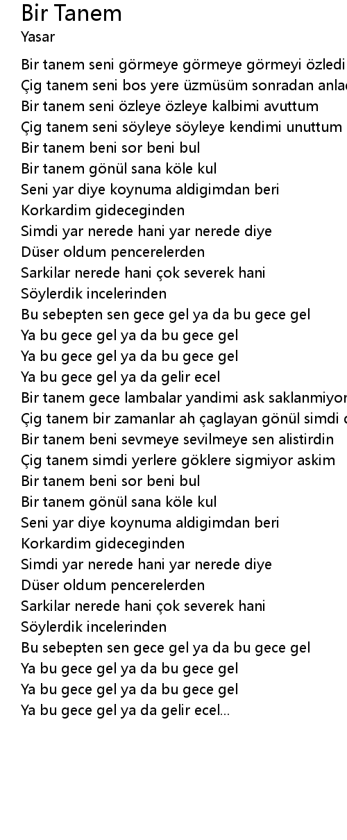 | Bir tanem seni görmeye görmeye görmeyi özledim | |
