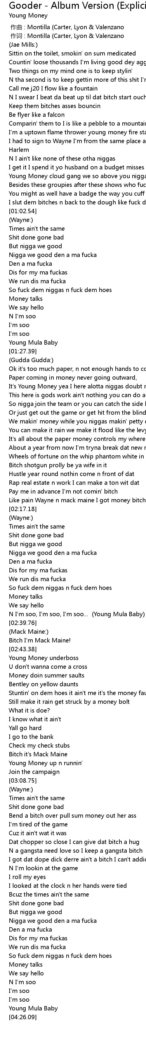 | [00:50.46] | Young Money cloud gang we so above you niggas |