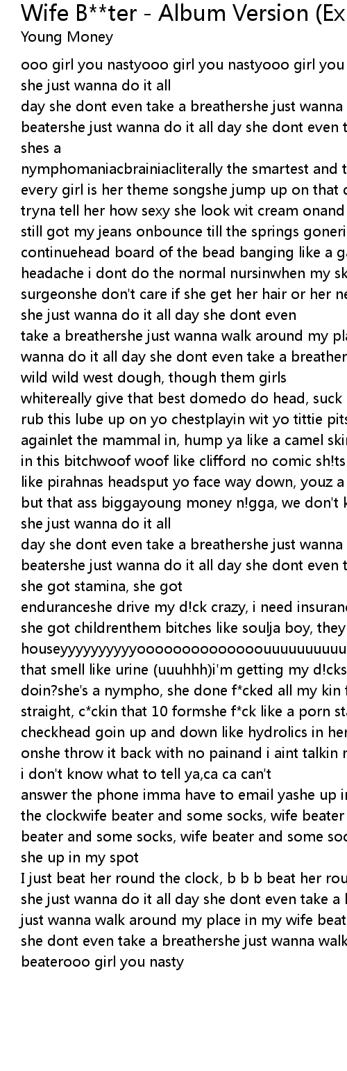 ooo girl you nastyooo girl you nastyooo girl you nastyooo girl you nastyooo that girl nastyooo girl you nastyooo that girl nasty[chorus]she just wanna do it all day she dont even take a breathershe just wanna walk around my place in my wife beatershe just wanna do it all day she dont even take a breathershe just wanna walk around my place in my wife beater[verse 1]shes a nymphomaniacbrainiacliterally the smartest and the taken factshe like girls so every girl is her theme songshe jump up on that dick and get her trampoline onim tryna tell her how sexy she look wit cream onand all she wanna know is why i still got my jeans onbounce till the springs goneride ya till you cant continuehead board of the bead banging like a gang memberand when i gotta headache i dont do the normal nursinwhen my skull hurtin yea she my skull surgeonshe don't care if she get her hair or her neck pulledshe could go all night her heart pump red bull[chorus]she just wanna do it all day she dont even take a breathershe just wanna walk around my place in my wife beatershe just wanna do it all day she dont even take a breathershe just wanna walk around my place in my wife beater[verse 2]wild wild west dough, though them girls whitereally give that best domedo do head, suck me deadleave that coffin wet, rub this lube up on yo chestplayin wit yo tittie pits, feeling like a kid againlet the mammal in, hump ya like a camel skininto her lions den, tiger dawg in this bitchwoof woof like clifford no comic sh!tshe open it but bite them lips like pirahnas headsput yo face way down, youz a gold diggasayin' flippa new city but that ass biggayoung money n!gga, we don't know none these n!ggashis girlfriend da only thing i remember ca-cause..[chorus]she just wanna do it all day she dont even take a breathershe just wanna walk around my place in my wife beatershe just wanna do it all day she dont even take a breathershe just wanna walk around my place in my wife beater[verse 3]she got stamina, she got enduranceshe drive my d!ck crazy, i need insuranceshe got stretch marks, cause she got childrenthem bitches like soulja boy, they be round the houseyyyyyyyyyyoooooooooooooouuuuuuuuuuuuu'inshawty got some f*ck in her bed that smell like urine (uuuhhh)i'm getting my d!cks sucked, what're you doin?she's a nympho, she done f*cked all my kin folksshe f*ckin em 14 weeks straight, c*ckin that 10 formshe f*ck like a porn star, be bouncin like a bad checkhead goin up and down like hydrolics in her neckt-shirt with no panties onshe throw it back with no painand i aint talkin no domestic violence,but she'll take your wife beater[verse 4]i don't know what to tell ya,ca ca can't answer the phone imma have to email yashe up in the spot, i just beat it round the clockwife beater and some socks, wife beater and some socks(w-w-w-wife beater and some socks, wife beater and some socks)c-c-co she up in my spot, co she up in my spot |