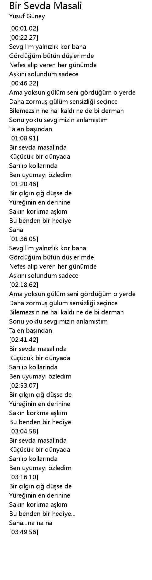 | [00:46.29] | Ama yoksun gülüm seni gördüğüm o yerde |
