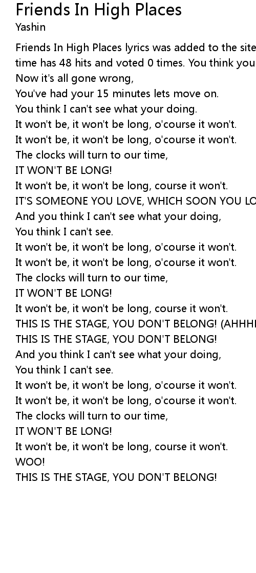 Friends In High Places lyrics was added to the site 27 Aug, 2010 and since that time has 48 hits and voted 0 times. You think you can stop us in our tracks, |