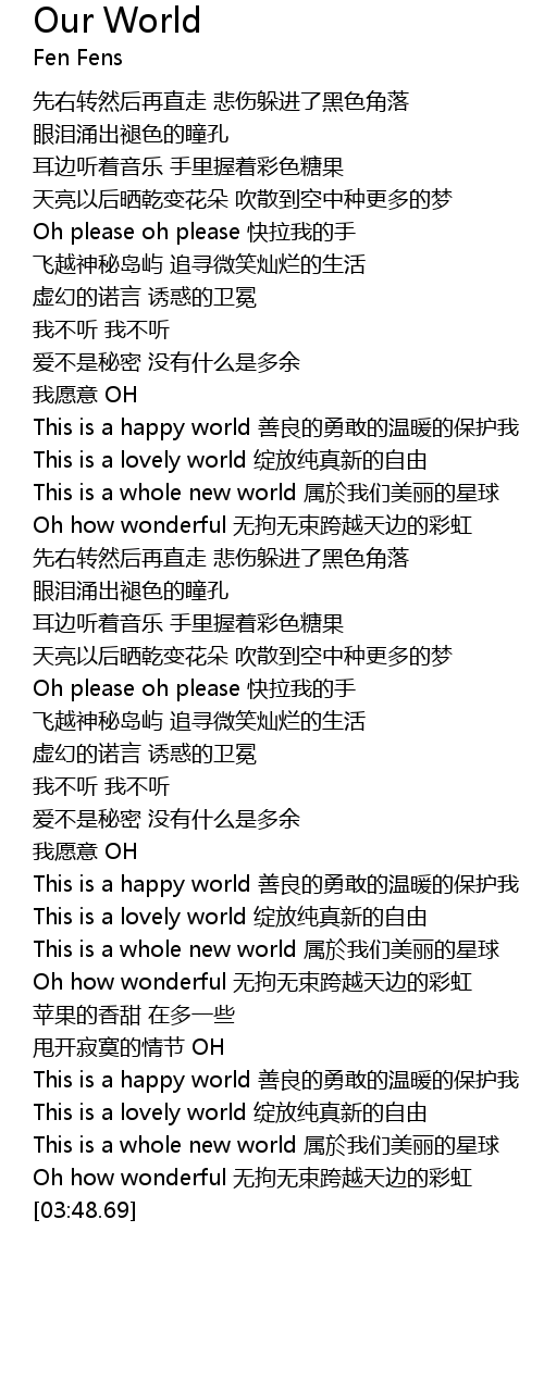 | [02:34.55] | This is a happy world shàn liáng de yǒng gǎn de wēn nuǎn de bǎo hù wǒ |