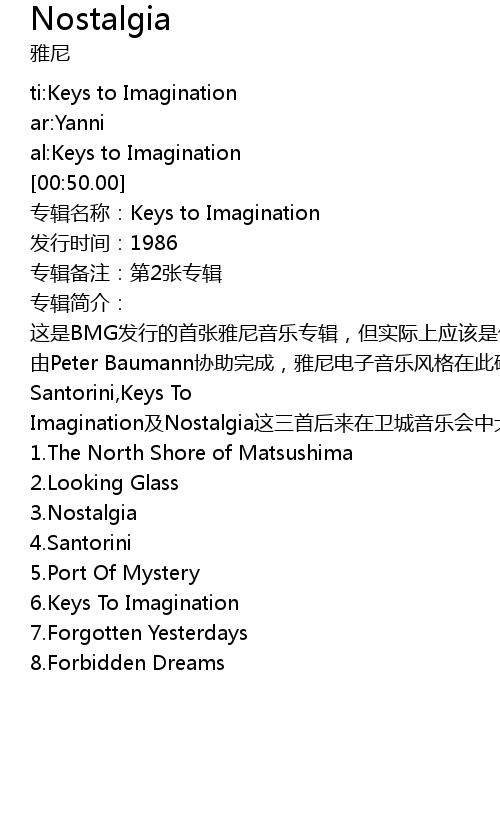 | [03:00.00] | Santorini,Keys To Imagination及Nostalgia这三首后来在卫城音乐会中大放光彩的作品最初均收录于此。 |