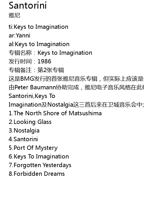 | [03:00.00] | Santorini,Keys To Imagination及Nostalgia这三首后来在卫城音乐会中大放光彩的作品最初均收录于此。 |