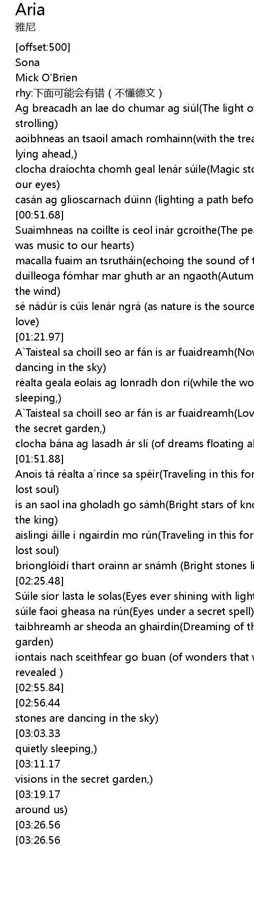 | [01:37.05] | A`Taisteal sa choill seo ar fán is ar fuaidreamh(Lovely visions in the secret garden,) |