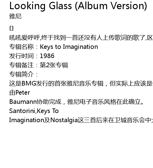 | [02:11.330] | Santorini,Keys To Imagination及Nostalgia这三首后来在卫城音乐会中大放光彩的作品最初均收录于此。 |
