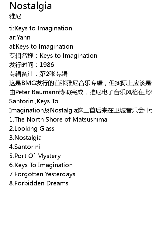 | [03:00.00] | Santorini,Keys To Imagination及Nostalgia这三首后来在卫城音乐会中大放光彩的作品最初均收录于此。 |