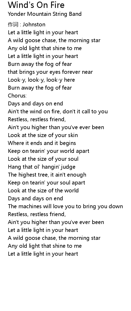 | Ain' t the wind on fire, don' t it call to you | |