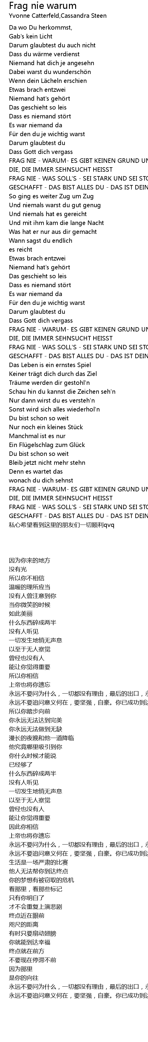 | [02:46.05] | FRAG NIE - WAS SOLL'S - SEI STARK UND SEI STOLZ DU HAST ES BIS HIER GESCHAFFT - DAS BIST ALLES DU - DAS IST DEINE KRAFT |