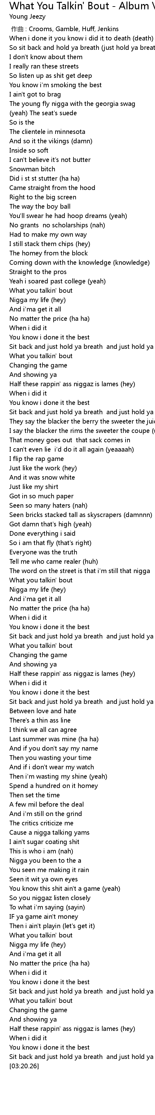 | [02:39.44] | Cause a nigga talking yams |