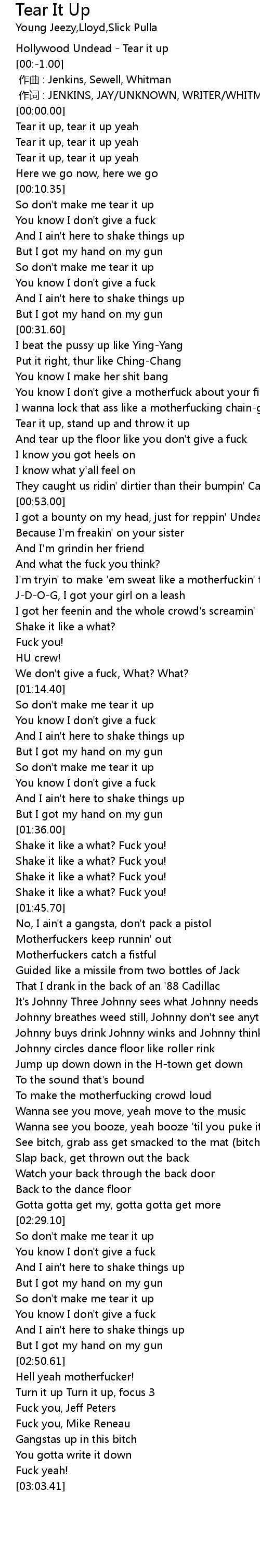 | [00:03.12] | Tear it up, tear it up yeah |