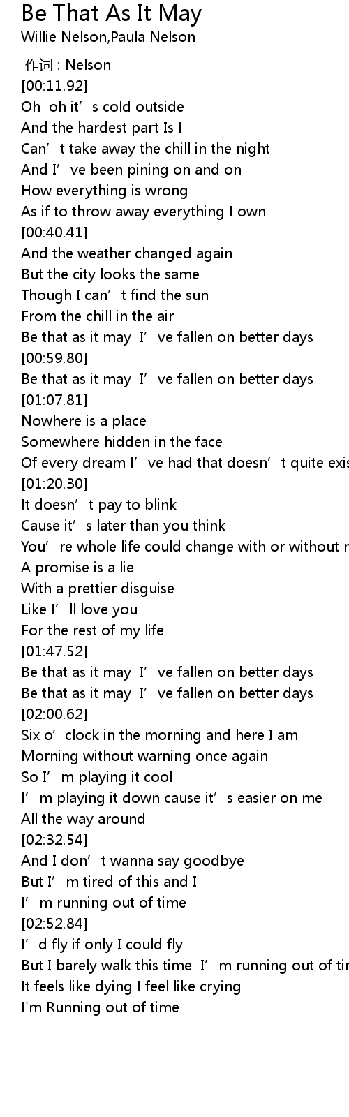 | [00:54.19] | Be that as it may I’ve fallen on better days |