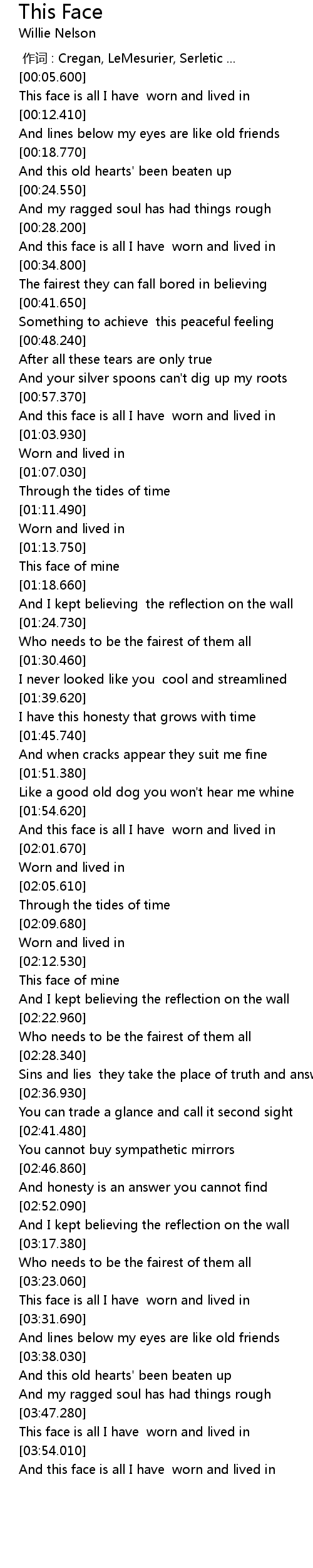 | [03:56.350] | And this face is all I have worn and lived in |