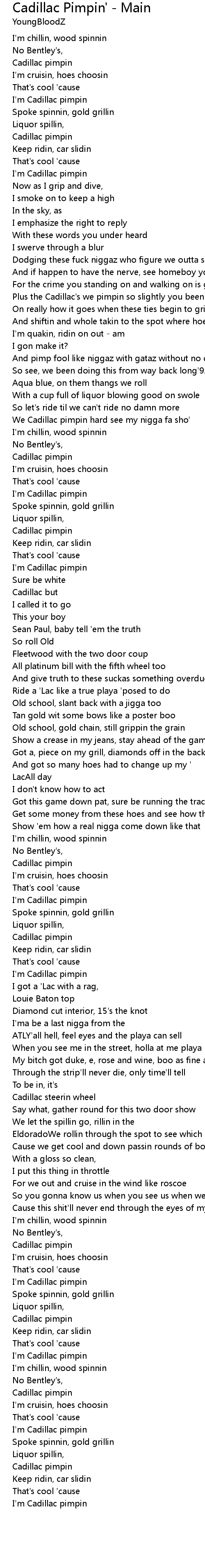 We Cadillac pimpin hard see my nigga fa sho' |