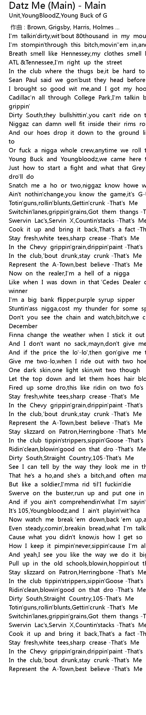 | [02:32.47] | It' s 105, Youngbloodz, and I ain' t playin' wit' hca |