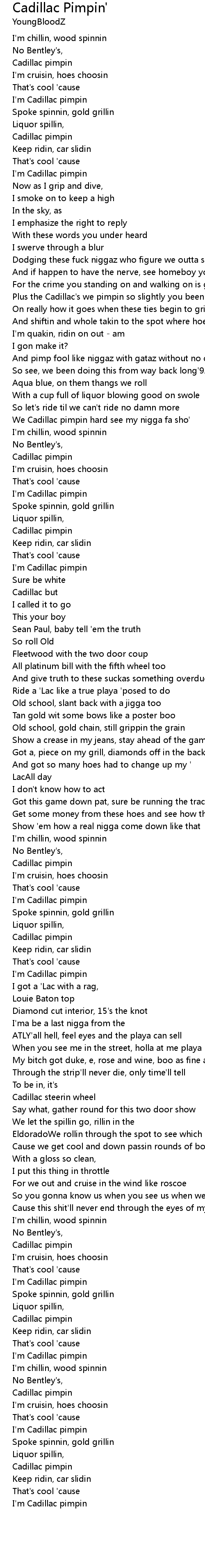 We Cadillac pimpin hard see my nigga fa sho' |